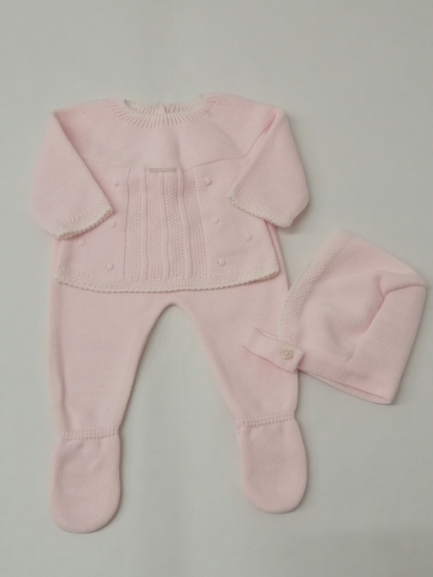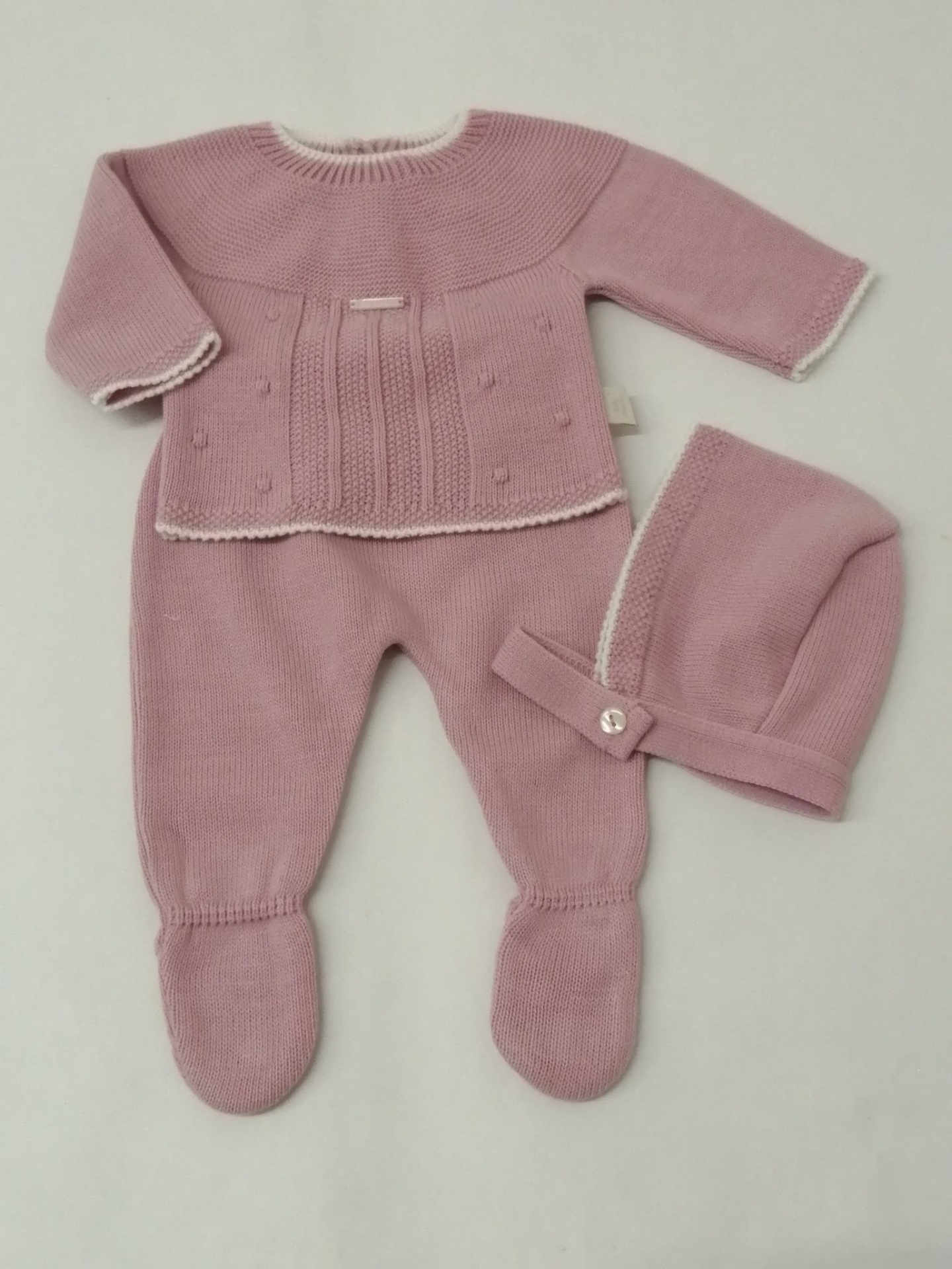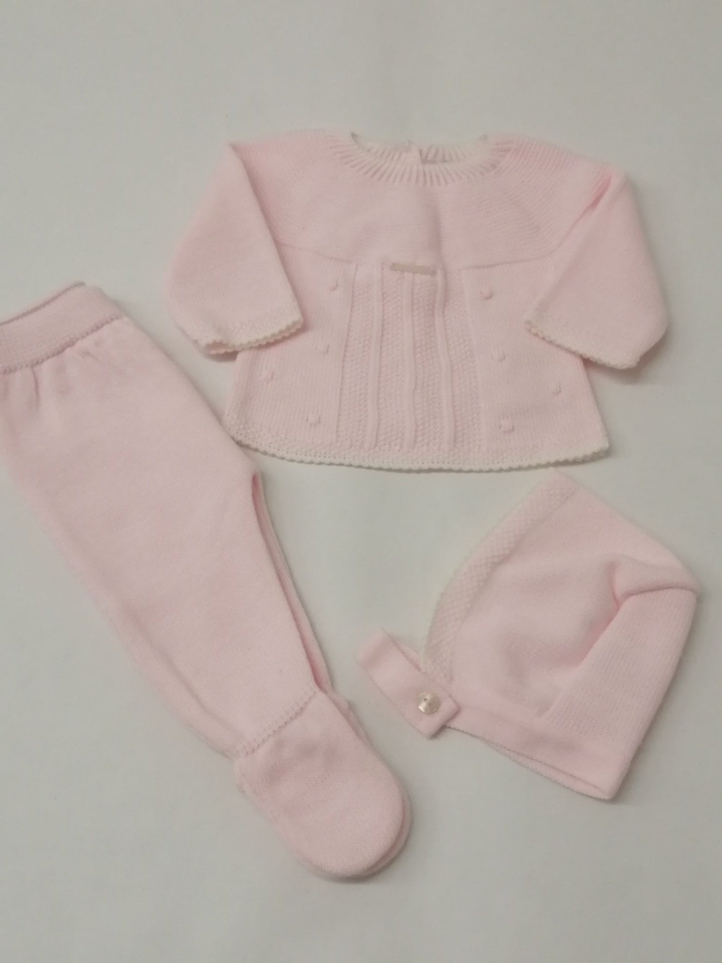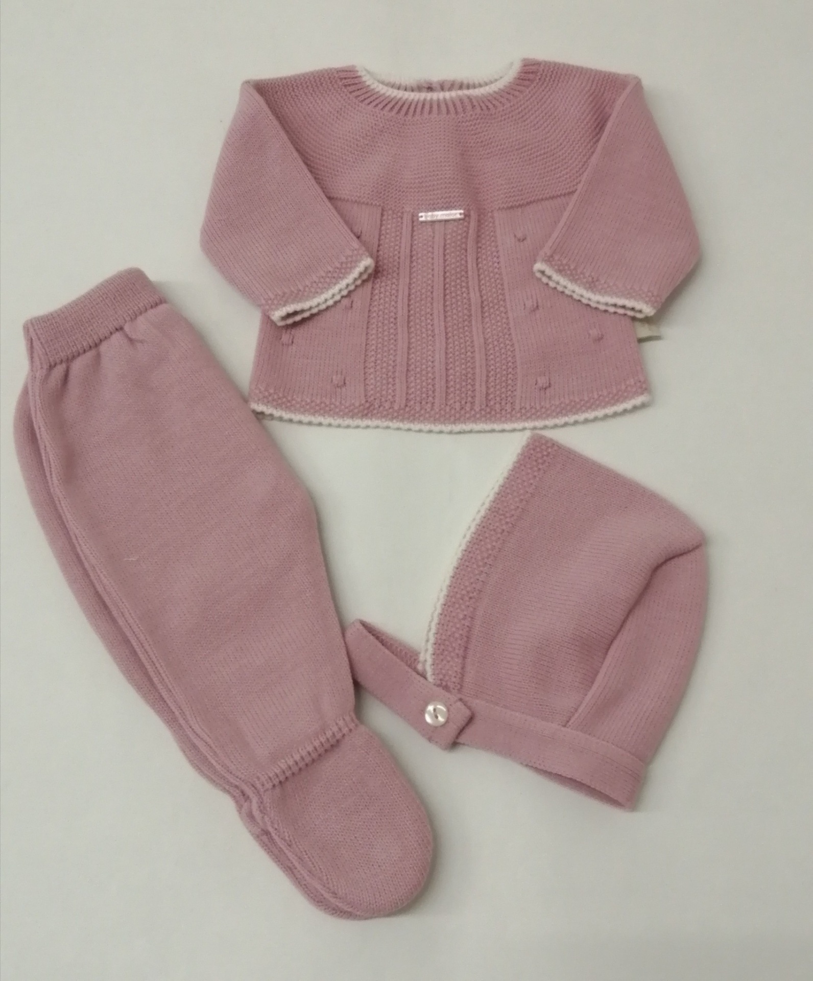 CONJUNTO MALHA BOLINHAS 26,50 € Desconto de %. Partilhar COR + TAMANHO ROSA VELHO - 1 MÊS ROSA VELHO - 3 MESES ROSA CLARO - 1 MÊS Comprar Contactar Conjunto malha - 3 Peças Calça com pé + camisola + touca 100% Acrilico
