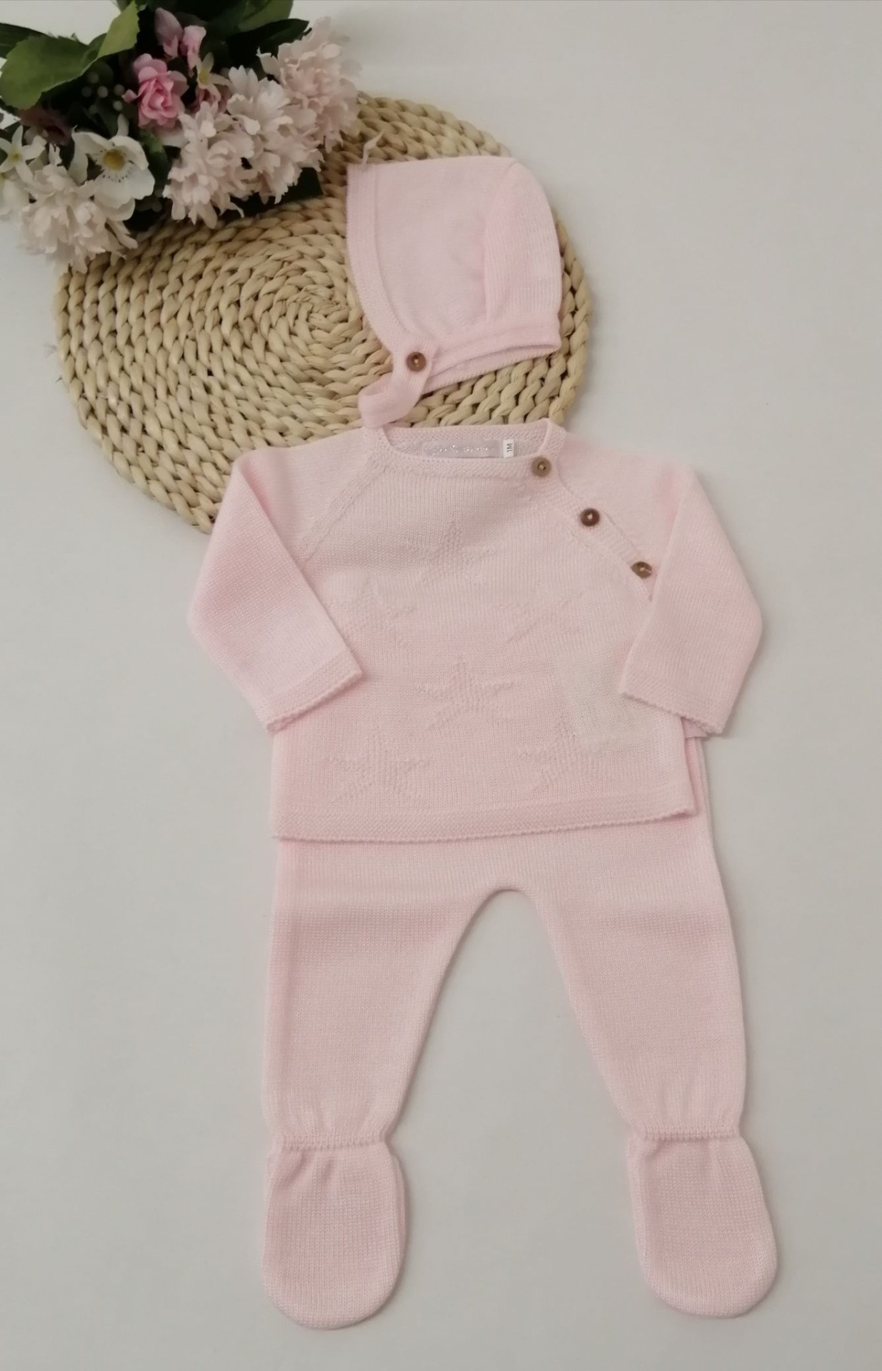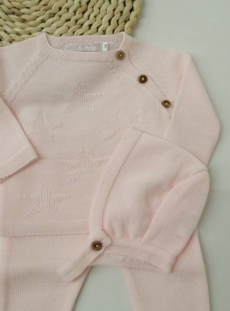 CONJUNTO MALHA ESTRELAS 24,50 € Desconto de %. Partilhar COR ROSA Comprar Contactar Conjunto malha - 3 peças Calça com pé , camisola e touca . 100% acrilico Tamanho - 1 Mês