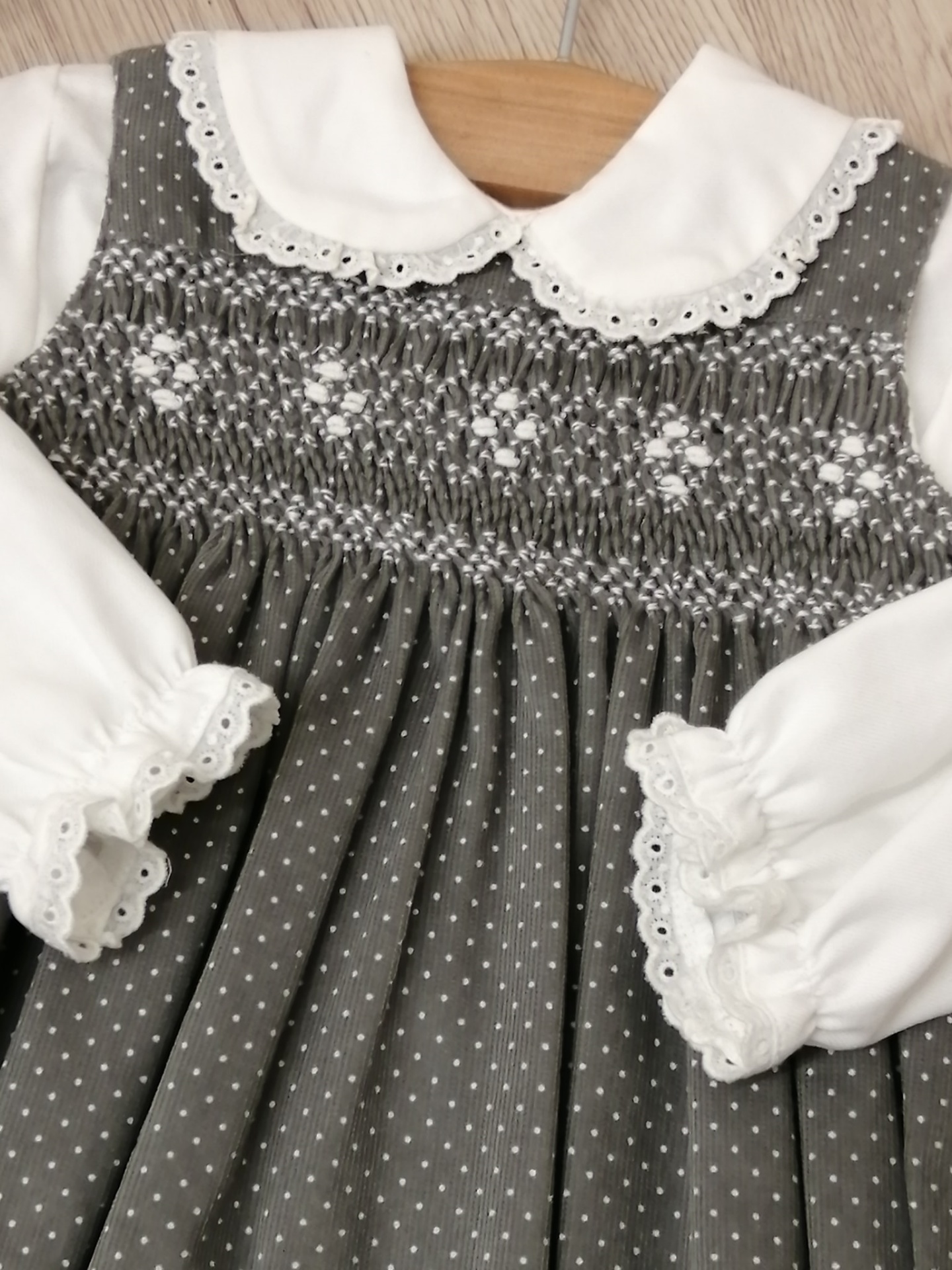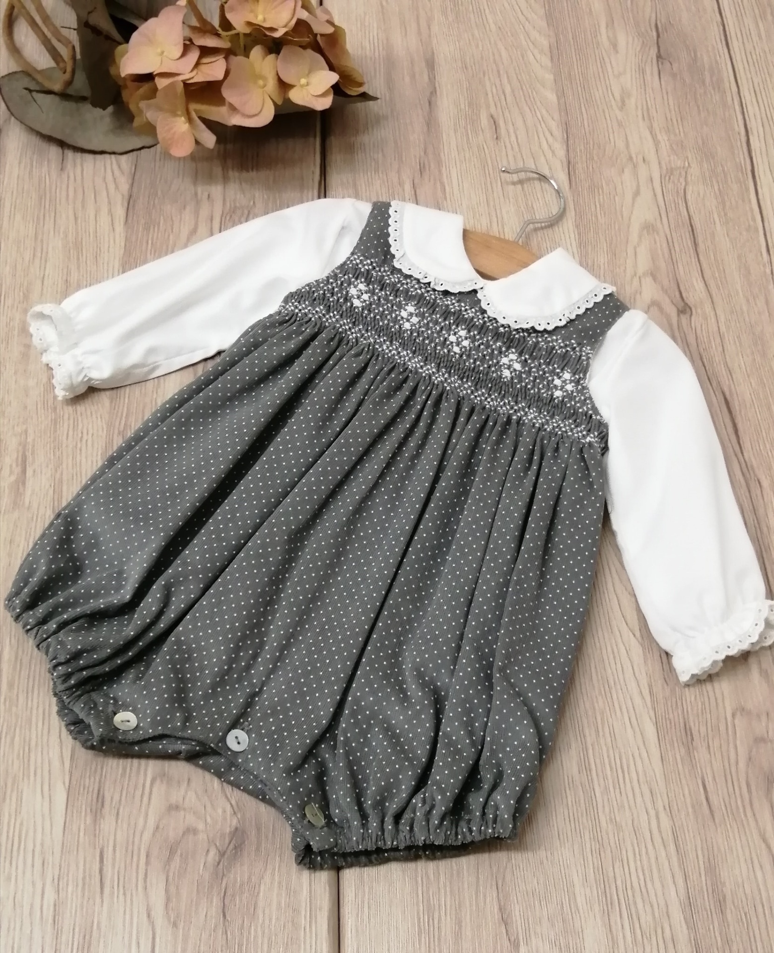 FOFO SMOCKS 52,00 € Desconto de %. Partilhar TAMANHO 9 MESES Comprar Contactar Fofo em veludo cotelet cinza pintinhas , com bordado smocks . Camisa em vaiela com bordado a condizer 100% Algodão Medidas 9 Meses - Contorno peito - 52 cm / Ombro ao gancho - 41 cm