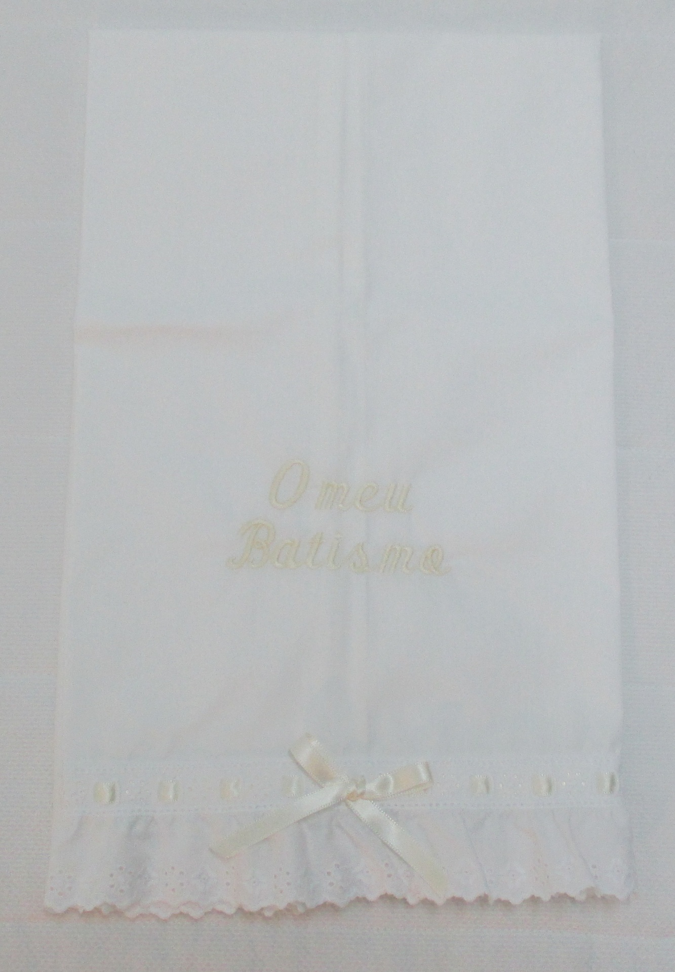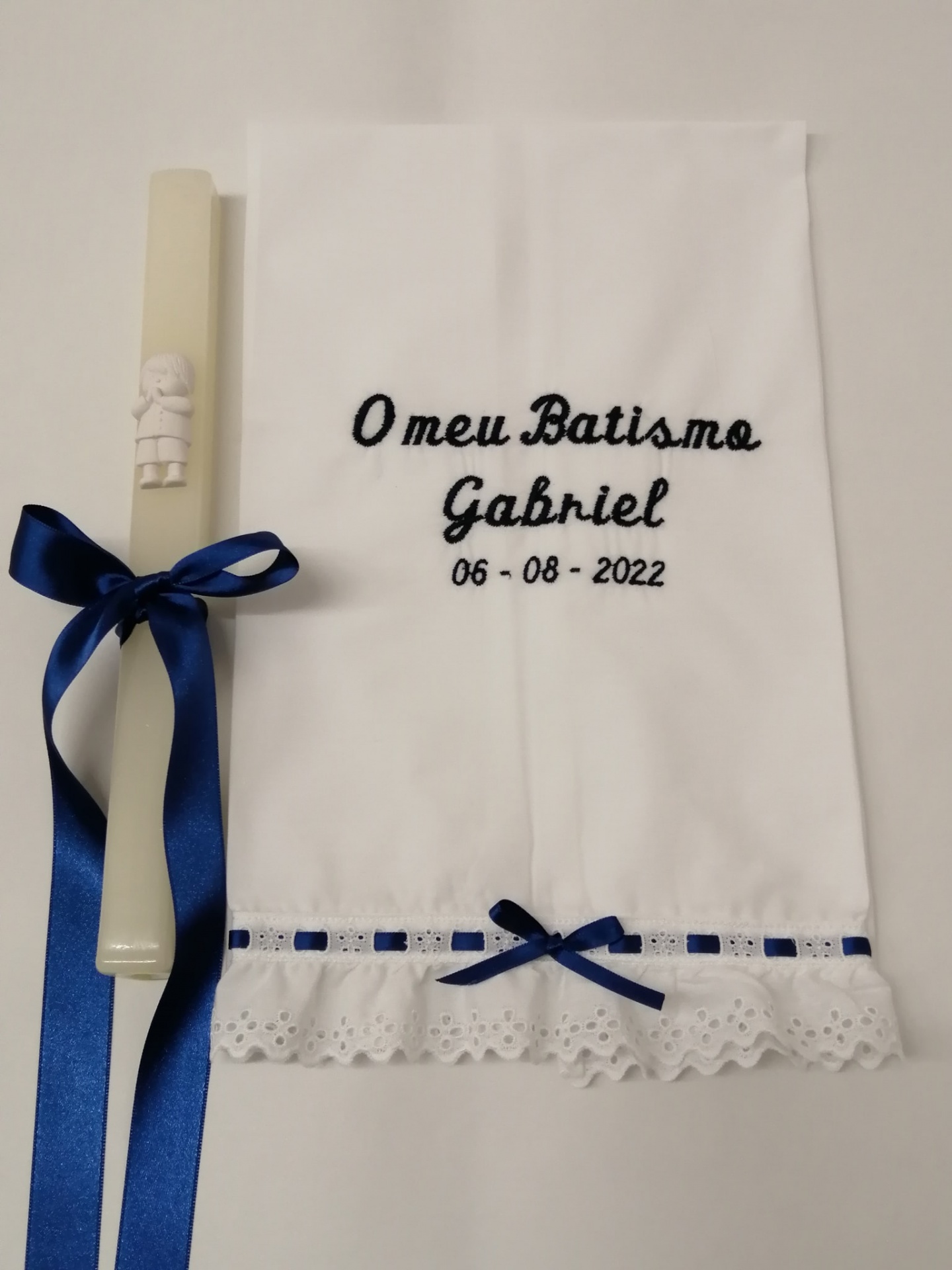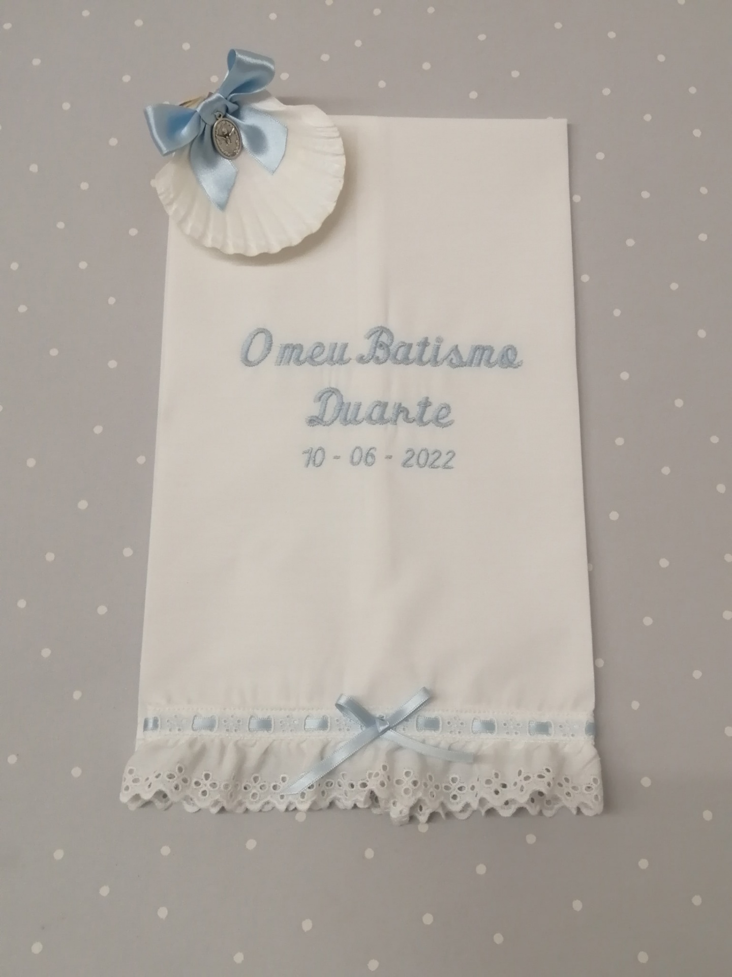TOALHA BATIZADO 14,50 € Desconto de %. Partilhar COR BORDADO ROSA AZUL PÉROLA AZUL ESCURO CINZA ROSA VELHO AMARELO VERDE ÁGUA Comprar Contactar Toalha Batizado . Tamanho - 40 x 70 cm 100% Algodão POR ENCOMENDA - 10 DIAS OPÇÃO 1 - NOME + DATA OPÇÃO 2 - O meu Batismo + NOME + DATA OPCÃO 3 - O meu Batismo ( Enviar p.f na confirmação da encomenda - opção pretendida e nome + data )
