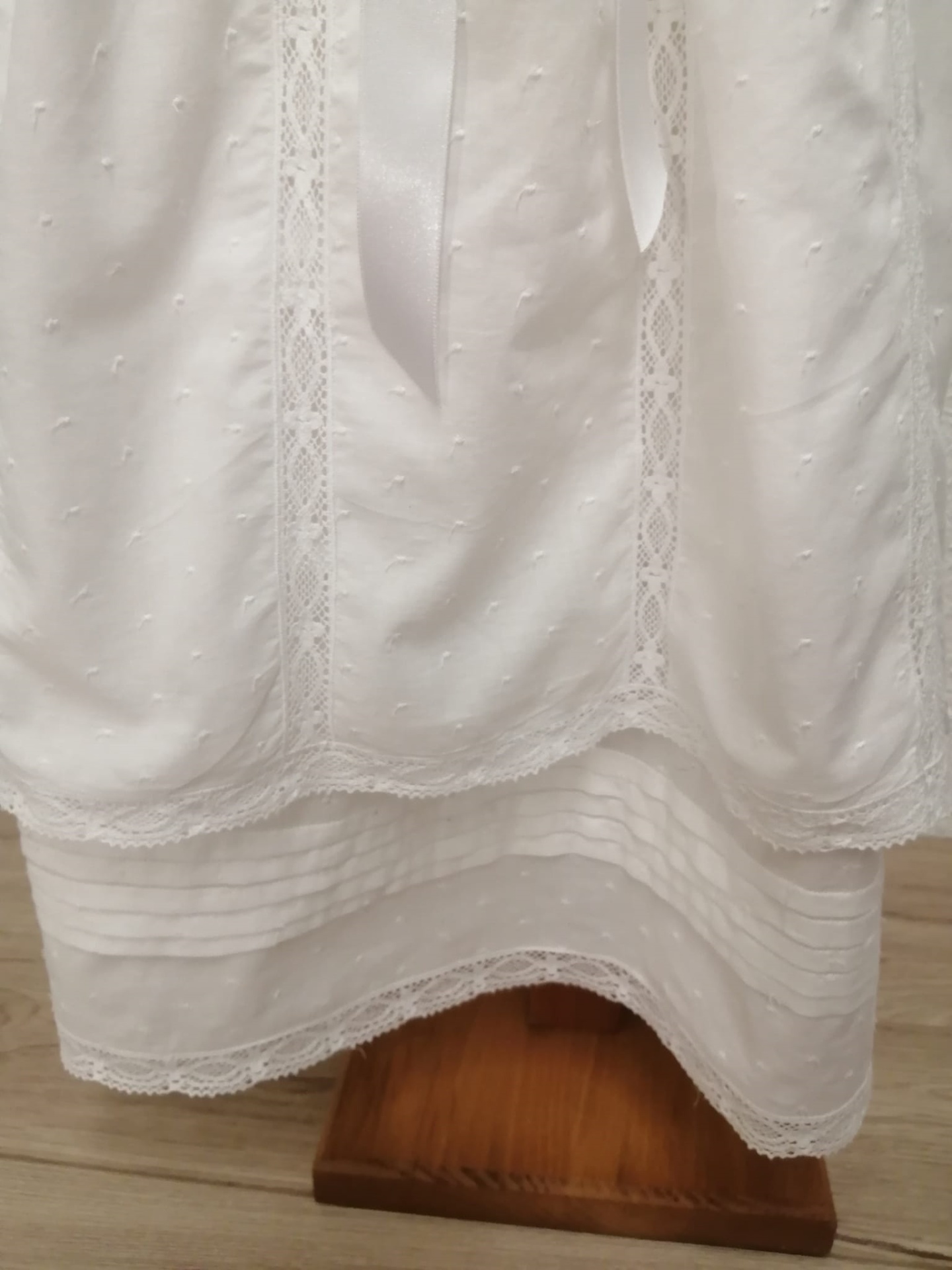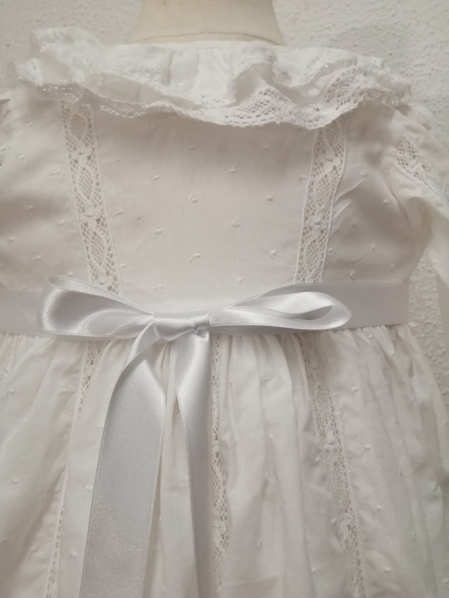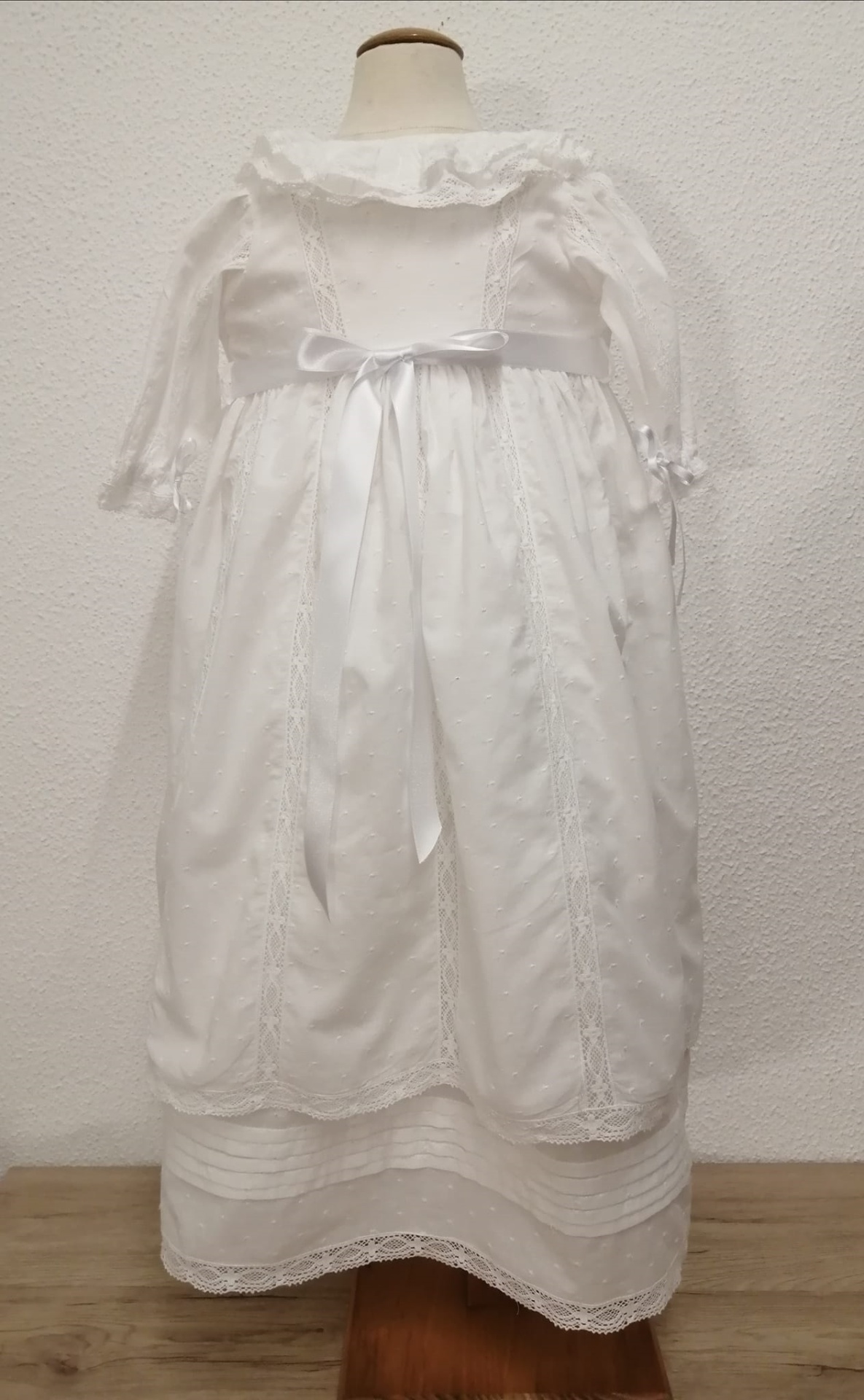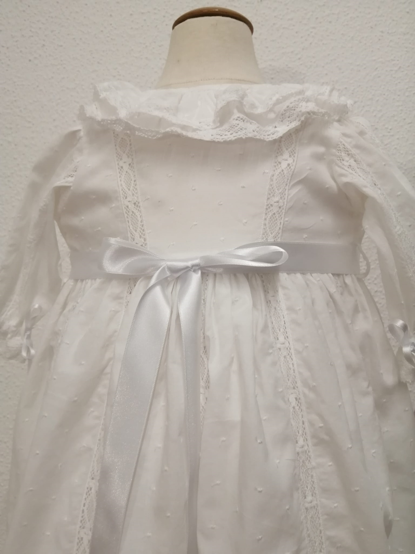 VESTIDO BATIZADO - VB144BR 110,00 € 130,00 € Desconto de %. Partilhar O produto encontra-se sem stock. Vestido Batizado com touca. Em cambraia branca com bolinhas bordadas, aplicações de renda e gola folho duplo. Altura total - 74 cm 100% Algodão ÚLTIMO VESTIDO TAMANHO 6 -9 Meses - Contorno peito - 56 cm / Comprimento manga - 24 cm