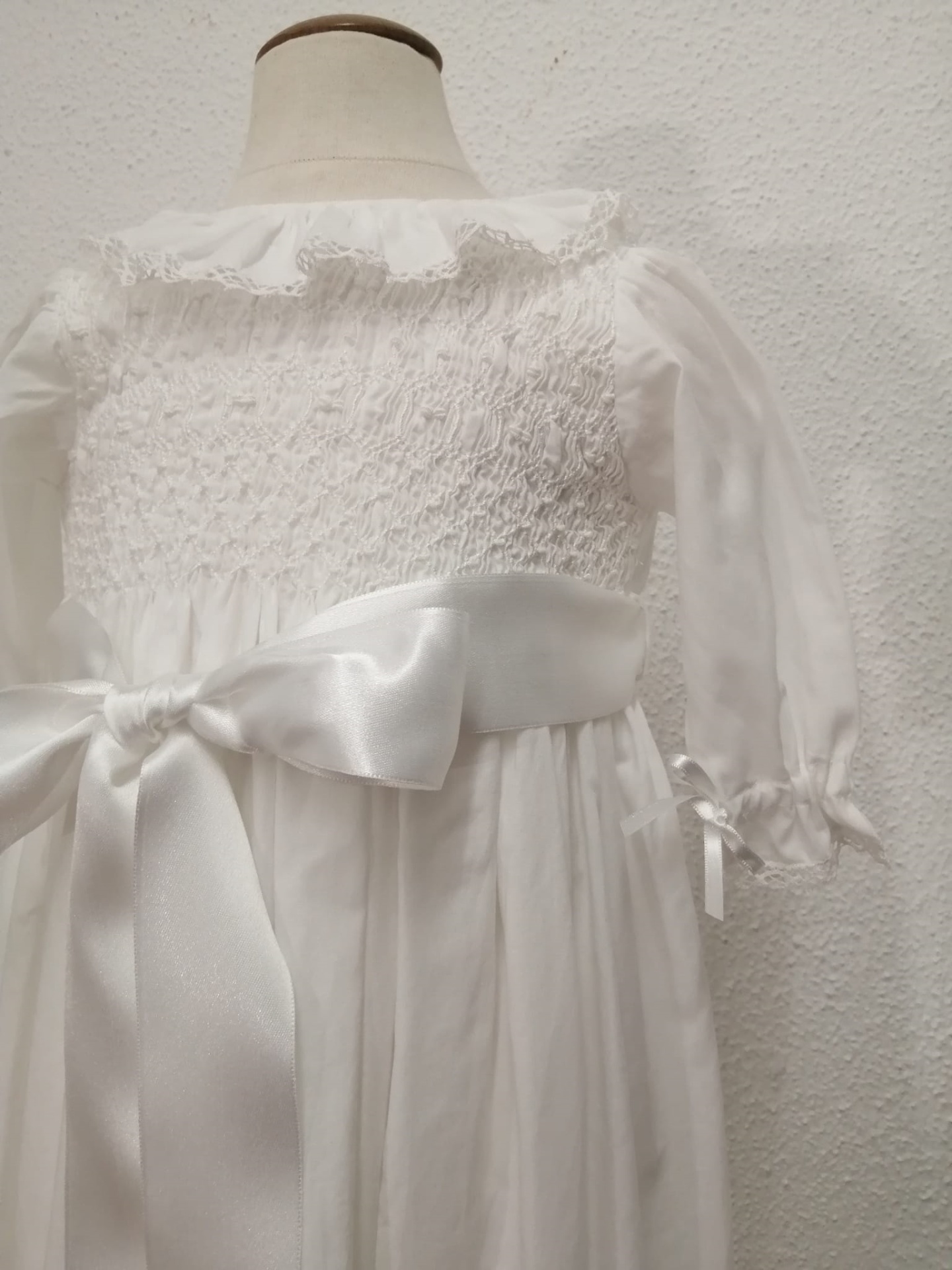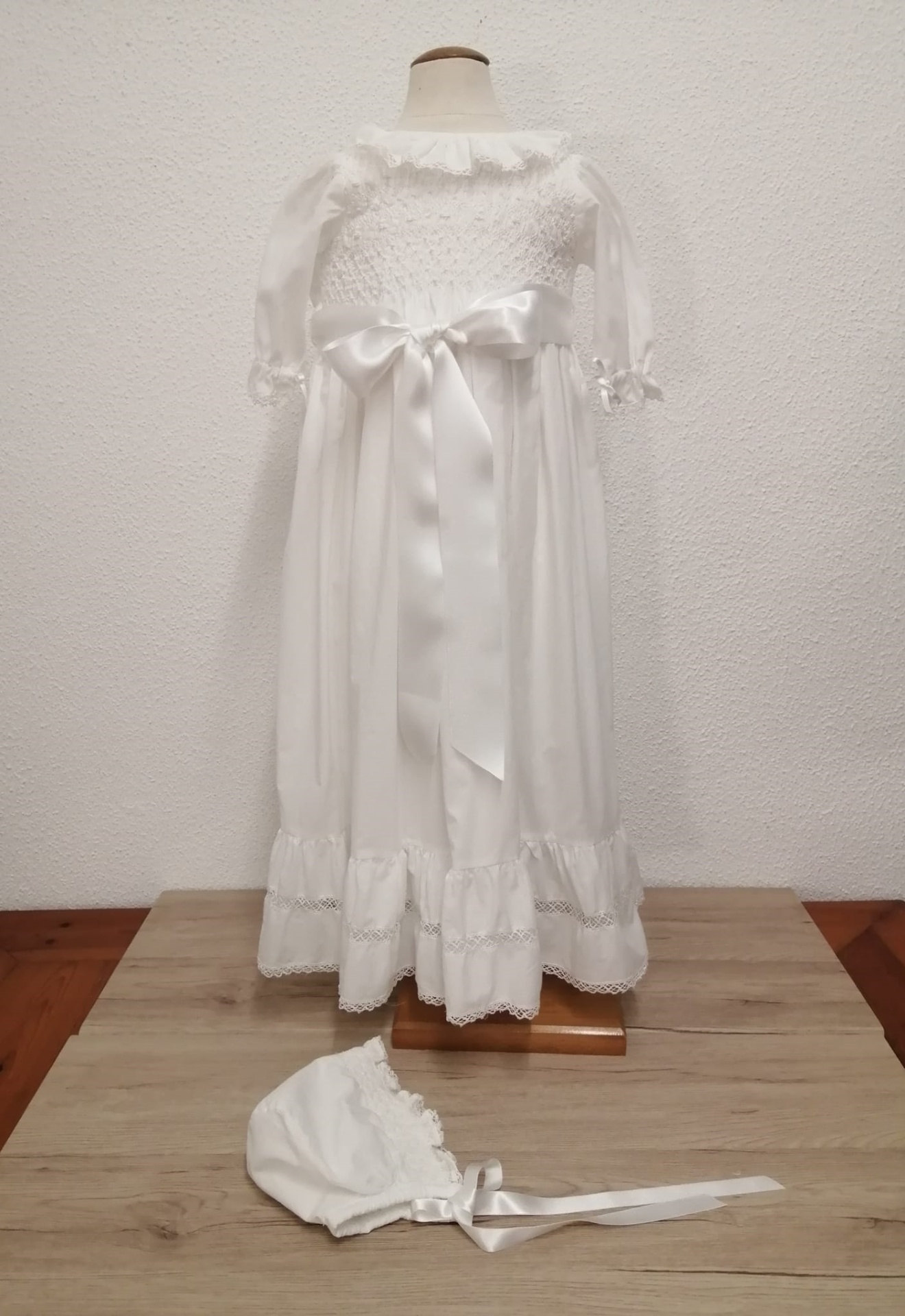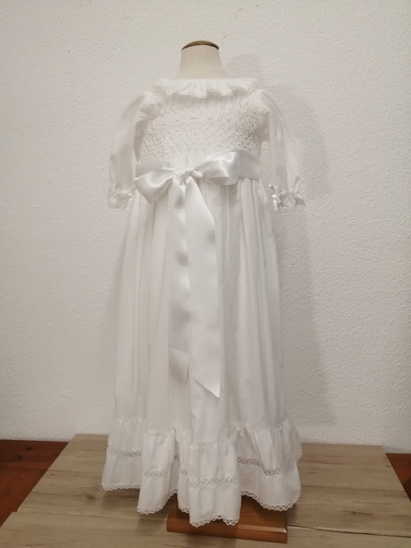 VESTIDO BATIZADO - VB892BR 120,00 € 160,00 € Desconto de %. Partilhar Comprar Contactar Vestido batizado com bordado de smocks e folho . Touca a condizer . TAMANHO - 6 / 9 MESES Altura total - 86 cm Contorno peito - 56 cm Comprimento manga - 23 cm