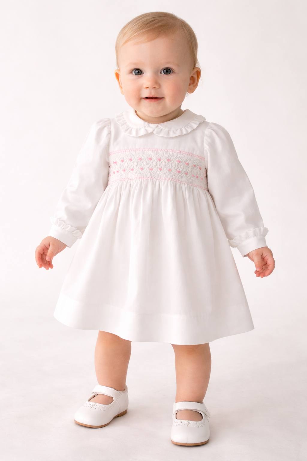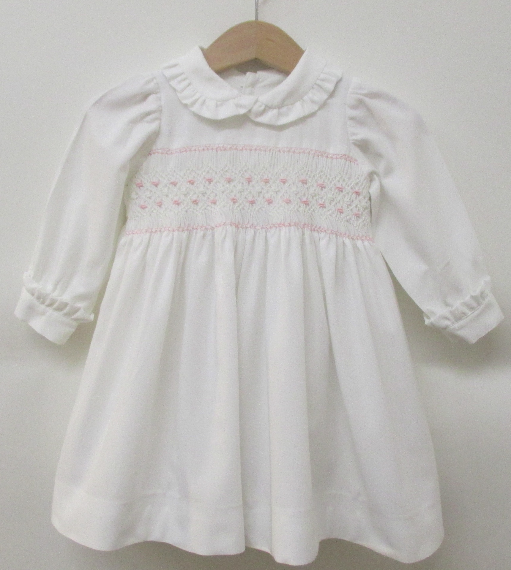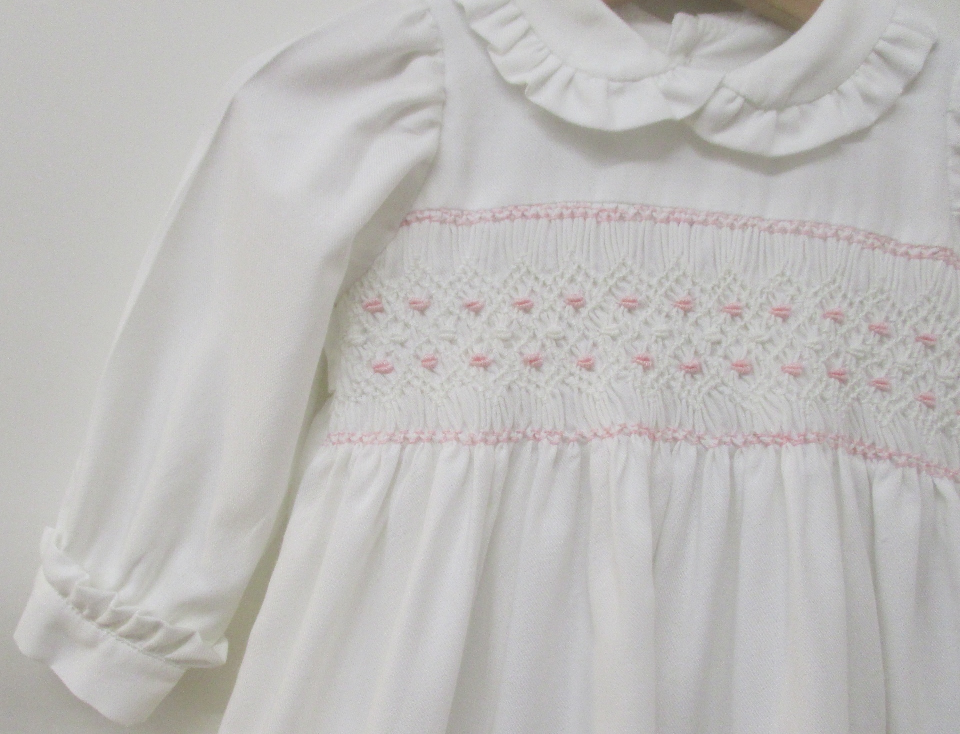 Vestido em vaiela branca com bordado de smocks .